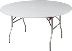 White round table cover. Easy to use, disposable, reusable, and yours to keep! We get it, sometimes rental tables are ugly. Use these one time, or reuse them again on your next event.